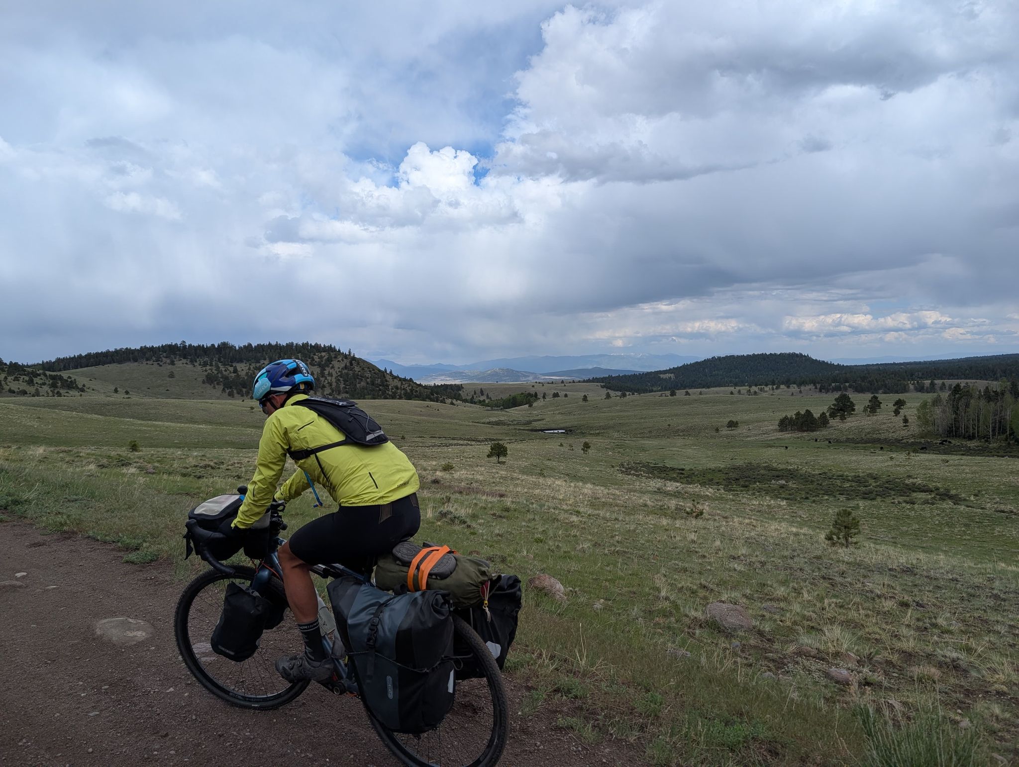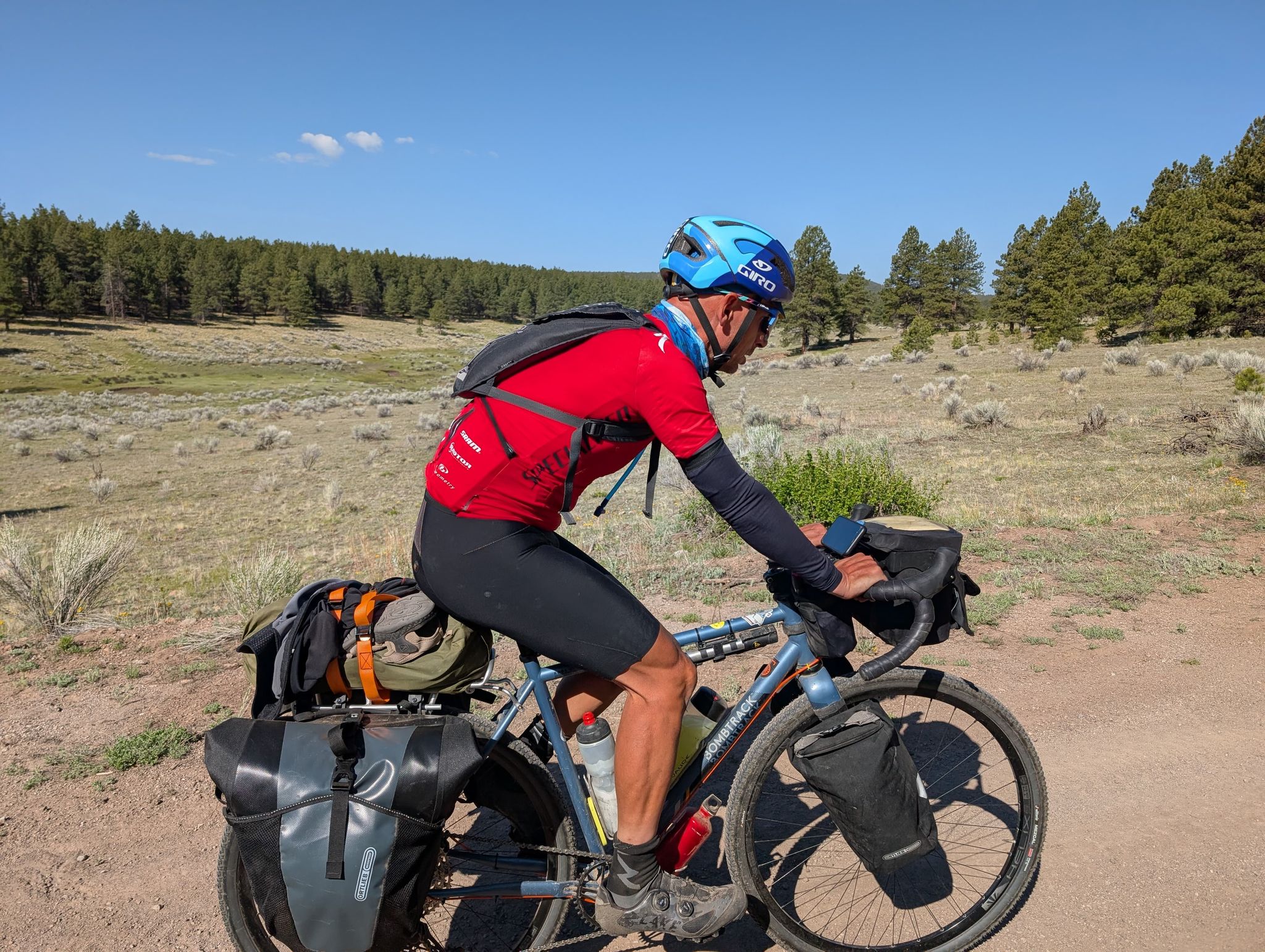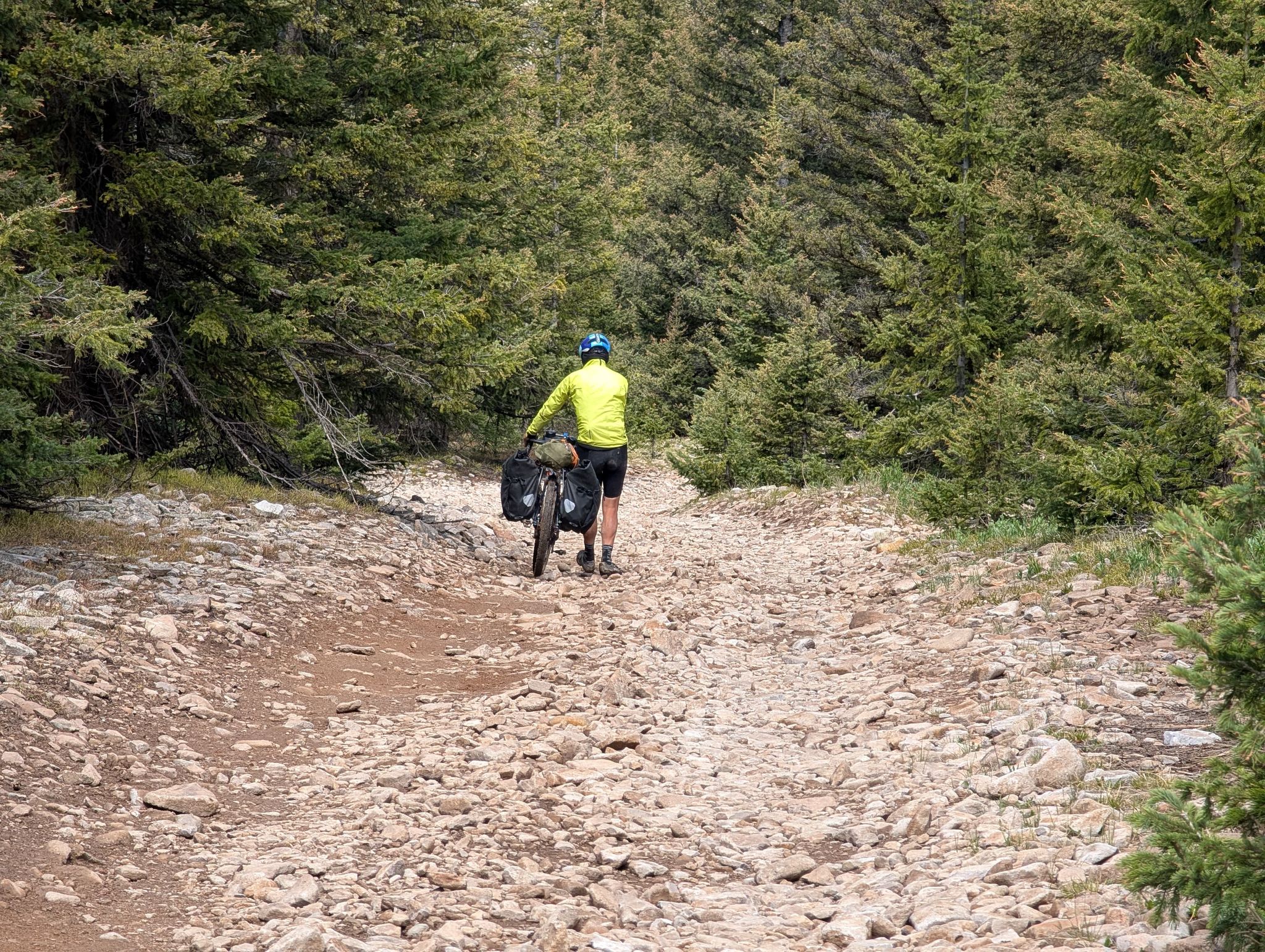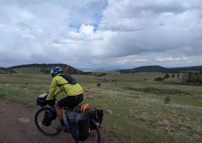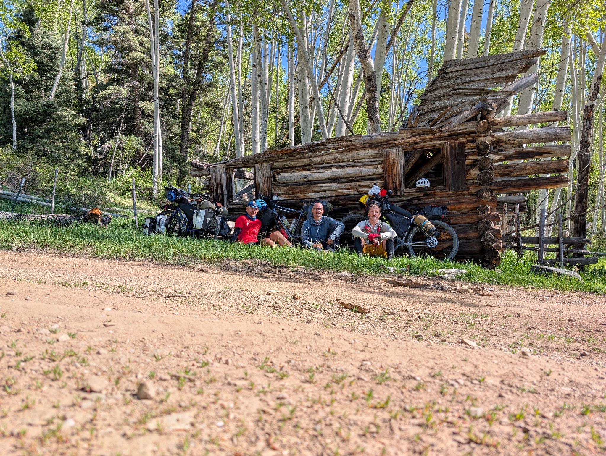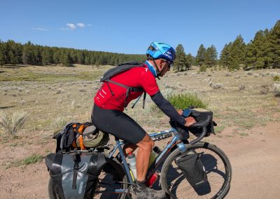 A day from hell! Well. It started ok, with a fantastic panoramic view across the valley. We all decamped and had breakfast, but I knew I was seriously under fed before starting out….never a good sign! We knew we had 19 miles of climbing before the first break at a lake high in the mountains. I felt ok on the first climb as the track was compacted. But as the trail reared up is started to get crazy rocky. Bob is a great gravel bike, but hopeless as a mountain bike. Plus, I’m not a confident descender on a rocky surface. Mike had a full blown mountain bike with massive tires so he simply cruised down the hills, whilst Jake and I gingerly found a way down…..before ascending the next climb. It was brutal, and zero enjoyment- you’d be putting out serious watts and going nowhere. Our average was 3-4 mph! I was seriously out of food and the altitude was taking its toll too. We stopped at an old cabin on a valley floor to get food then hit a massive climb which we all walked up. It was at this point I simply wanted to quit. I was so exhausted and hungry. But we kept on going until we got to Hopewell Lake. There was a log shelter there which we all simply crashed out in. We filtered water from the lake as we were all running very low. The next section was a downhill bit of road for 5 miles before back on the trail. That newer section of the trail was manageable but it started the long haul up the mountain. In the background we could see snow on the peaks. Whilst it was extraordinary scenery, most of us were too buggered to look up from the trail. Take your eyes off it for a second and you hit a protruding rock. Bobs headset was getting smashed and I was equally smashed. Eventually we got on to a valley floor, found a stream and pitched tents. We all just went and sat in the stream, despite its coldness. That was the first wash in days!