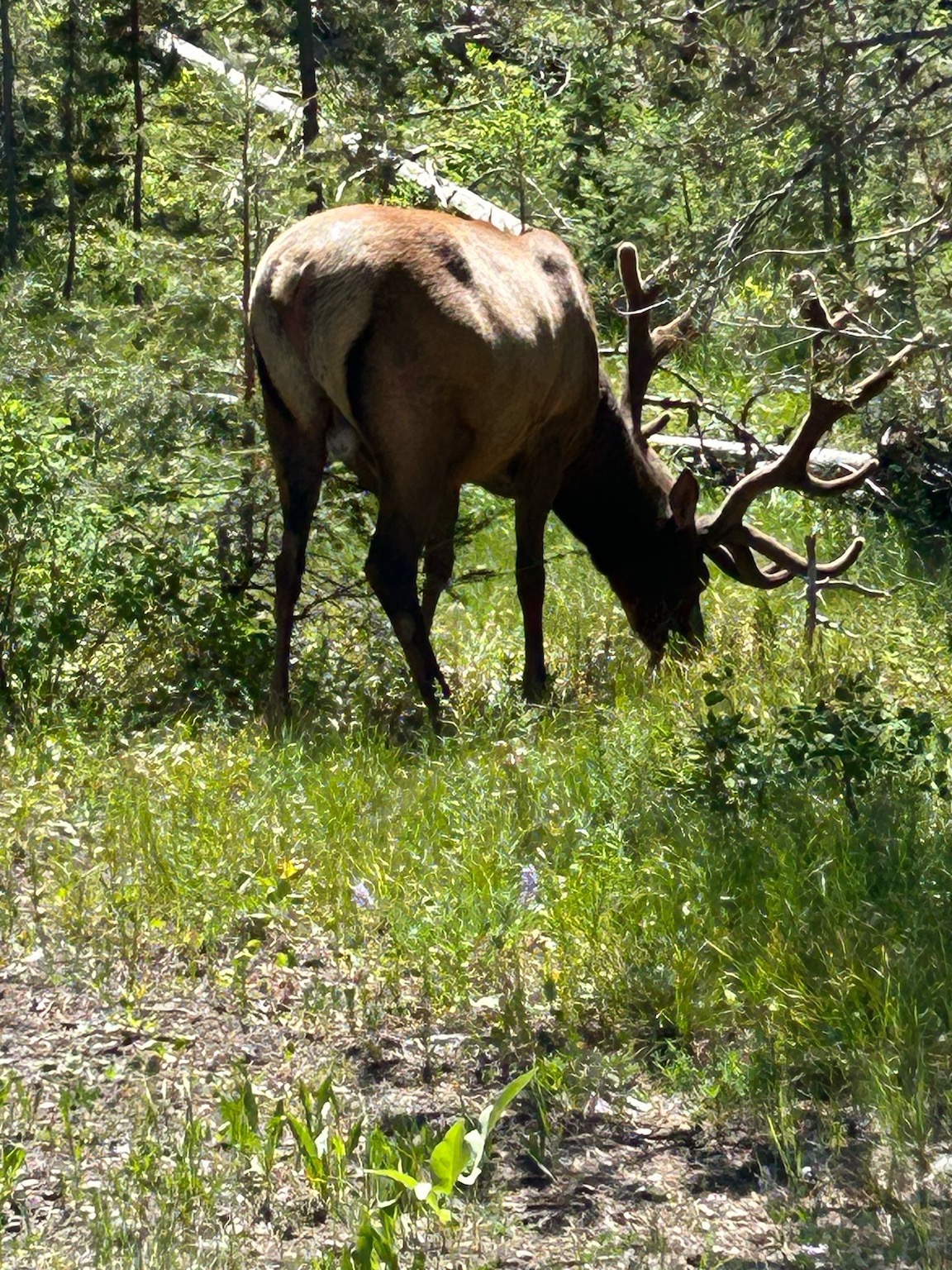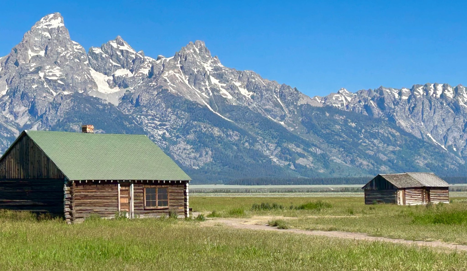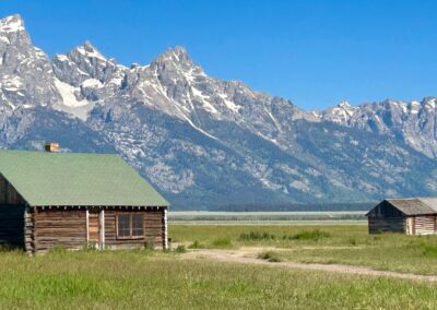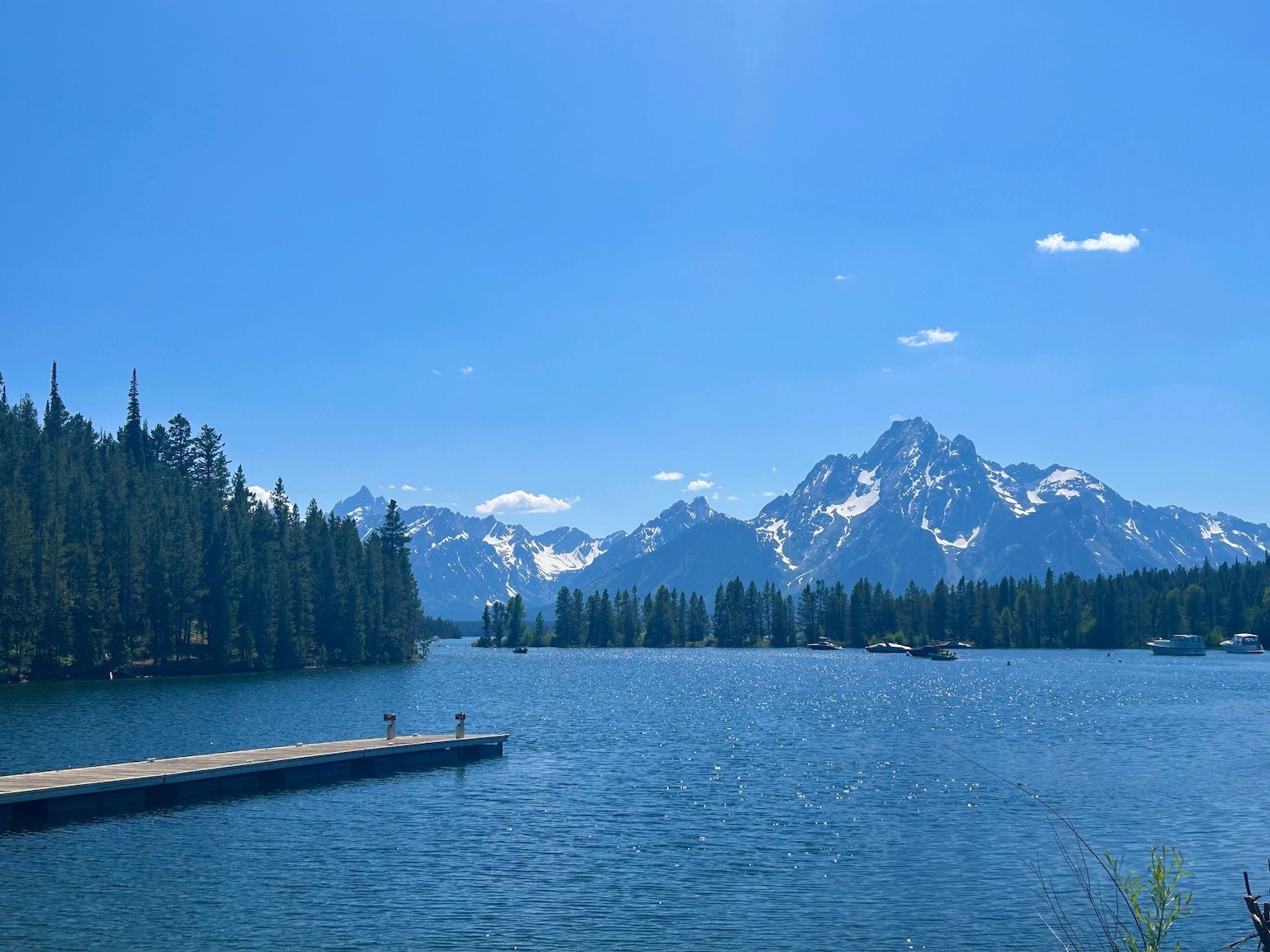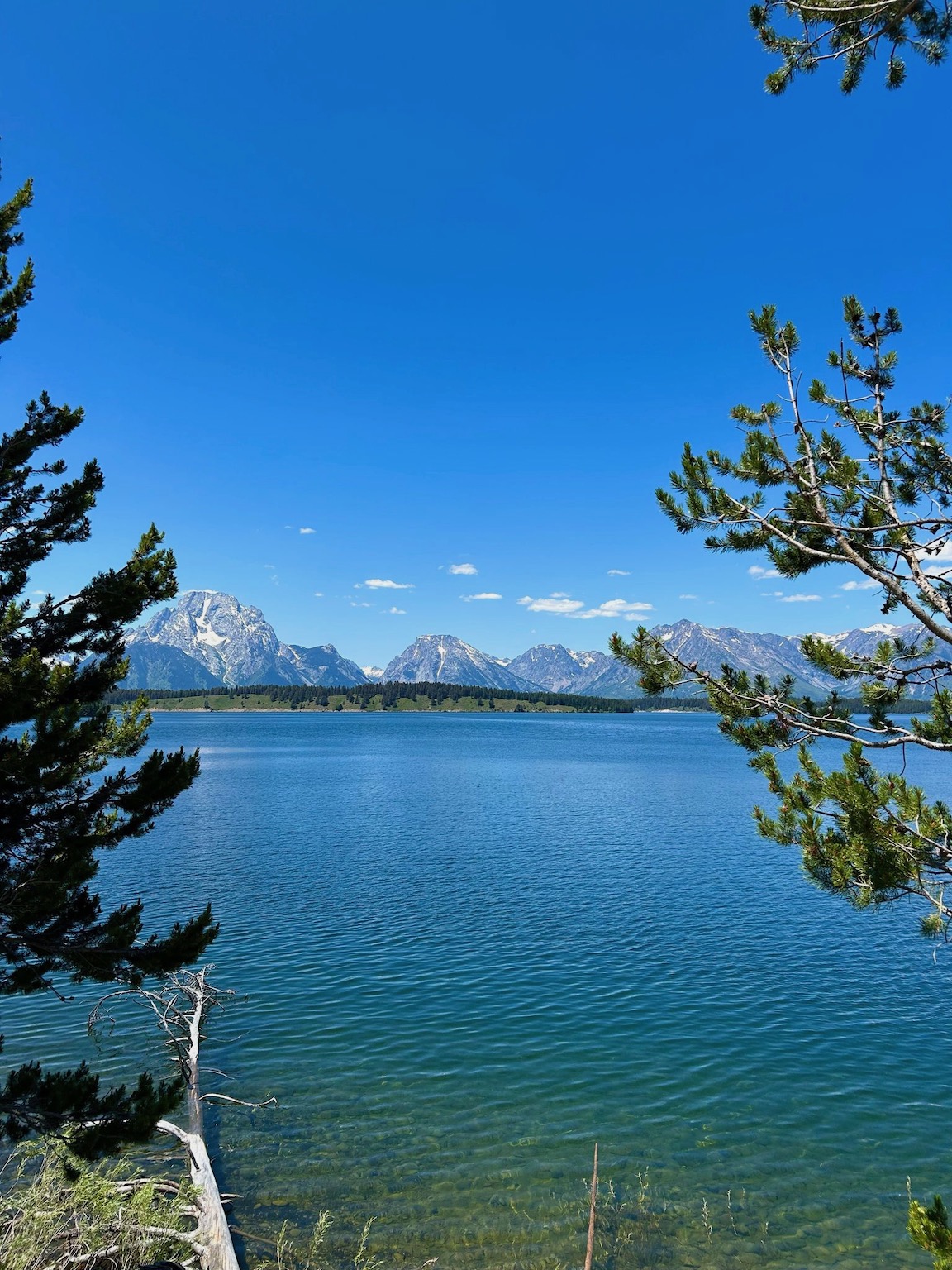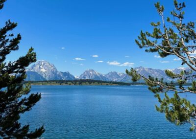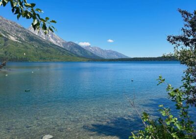 Riding on my own for the first time since week 1 was both strange but also enjoyable too. I had planned a route through the Tetons which wasn’t too challenging and not too long – around 35 miles. I took the back road through Kelly and Moose, and took the Teton road. I stopped for a morning coffee just before the Park entrance where you needed to pay $20 to access the park. As I was waiting to pay a lady in a car also queuing politely exclaimed ‘there’s a bear 10 metres behind you in the trees’! I didn’t stay around to see! I got in to the Park and was treated to a cycle lane all the way to Jenny Lake….which was just as well as gee, the road was jammed with RVs, cars and caravans. High season here! Jenny Lake was stunning….the whole area is stunningly beautiful with the rugged Tetons forming a majestic backdrop right through the Park. I stopped again at the Lake….i was determined to slow down and also give my sores a break. I grabbed a coke but it was so thronged I had to get away – too many people!