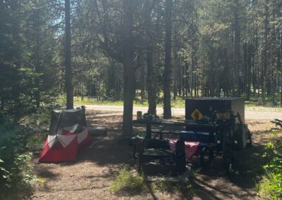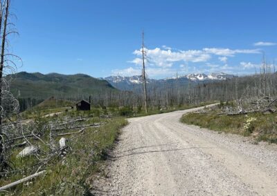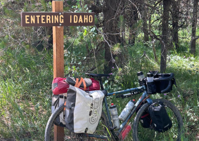 After a crappy night as my stupid air bed got another puncture I got up and packed away then scooted over to the camp restaurant where they were serving breakfast for $12 . Cereal, fruit, yogurt and muffins. Mysteriously some muffins jumped in to my pannier …..weird 🤣. I started out with a guy called Max from the UK – he’s a strong rider (and much younger!) so it was hard to stay with him but managed it until the gravel when he just sped off – oh to have that ability. The first part of the gravel was actually very good with some extraordinary scenery. It was good to ride at my own pace and stop when and where I wanted to, but I missed the lads. I took a break at a reservoir before things started to go a wee bit pear shaped….in that the gravel turned to sand. Good god that was crazy hard. Bob would just bog down and more times than I could count the front wheel went one way and the rear the other! I really struggled. I had identified a camp ground around 35 miles in but was anxious about bears! I met a lot of south bounders which broke up the monotony of the sand riding. Mid way there was a lodging hut just off the trail which could be rented out. I got around the gate and found two huts and a toilet…and a well pump which eventually spewed lovely water – I was out, so perfect timing. I stayed there for an hour resting in the midday sun and wind. I was buggered. But I knew I wasn’t supposed to be there so decided I’d try for a campground a further 14 miles on. I crossed the border in to Idaho and mile by mile clawed my way to the ranch where I could camp. It was a quirky place with the hostess out of her head on something and her long suffering husband cooking up meals! It was a great little set up, with showers, hot water, a camp kitchen but also serving meals!