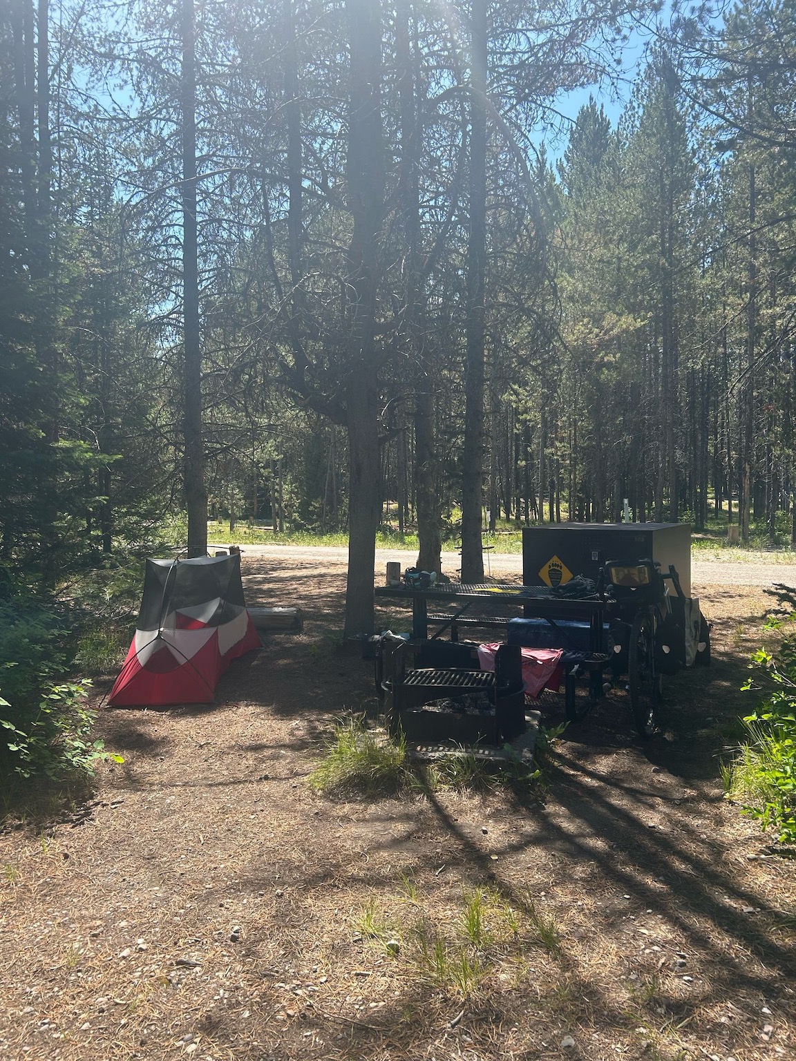 I got to the national park camp at Colter Bay around 2:30. This is a state run park which has designated ‘hiker-biker’ camping which was just as well as the campsite was full. There’s a grocery store here which charges obscene prices for basic stuff but I treated myself to a ham sandwich and milk coffee and a fruit bowl – delicious. The rest of the afternoon took on a familiar routine – tent up, bike sorted, wash and cook an evening meal.