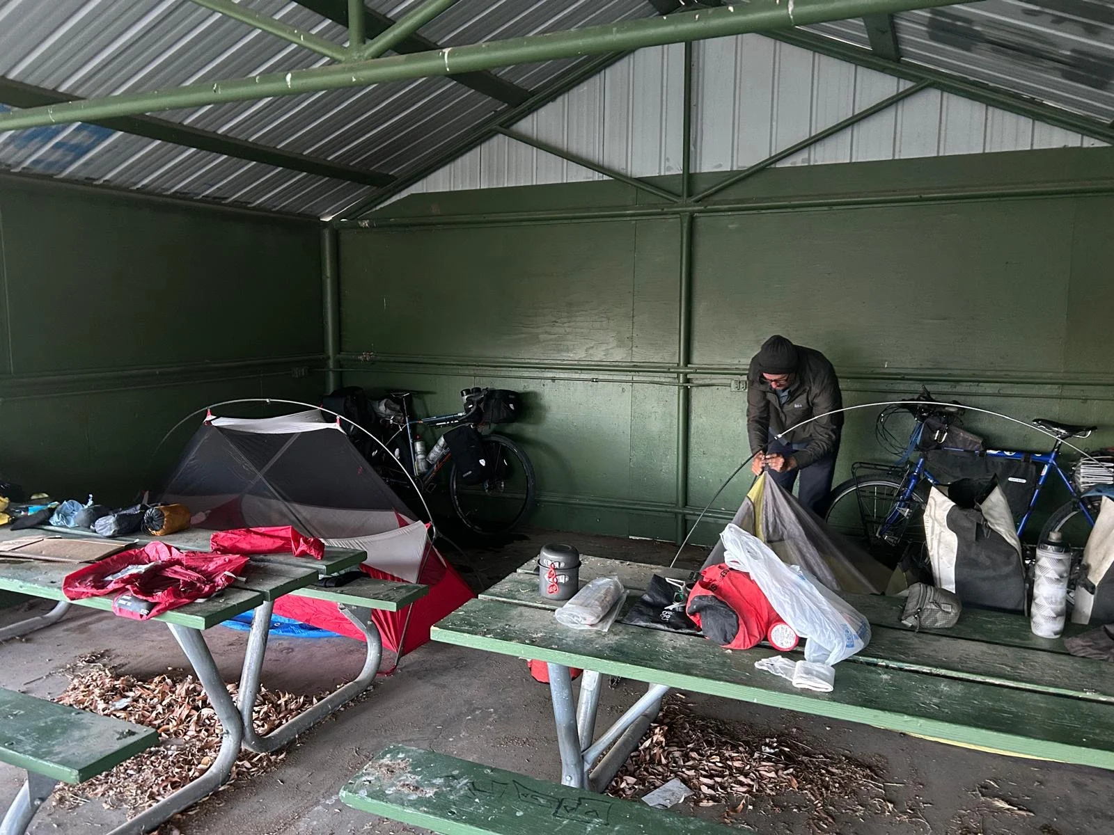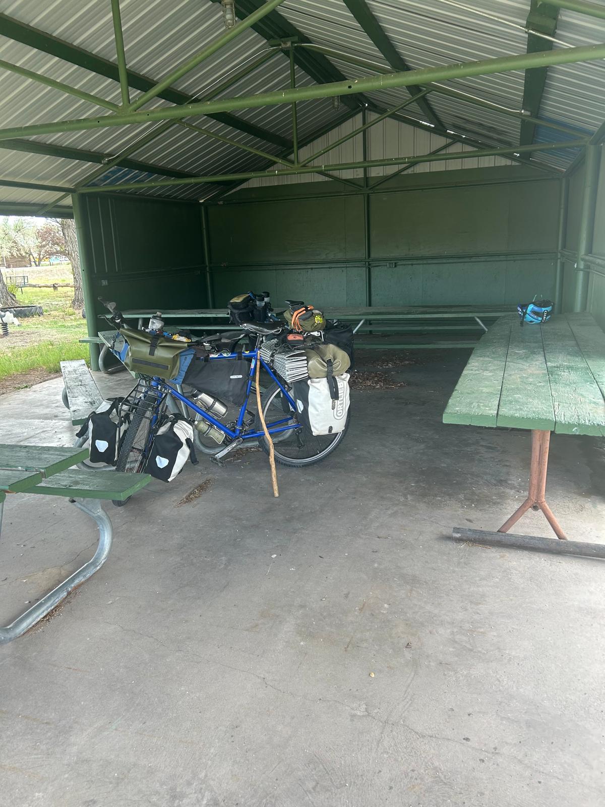 As he returned I had struck up a conversation with a local who was asking about our (hairbrain) cycle. He turned out to come from Cork 🤣🤣. We had decided we could not ride on as the wind was simply too dangerous. Patrick, the local resident, indicated we might be able to camp in the park, so we went with him to ask the local ‘mayor’ who responded ‘they look much better than the usual lot that sleep in the park!’ Jack and I wandered over to the park where there was a veranda which had…wifi and power 🤣🤣. We had a very leisurely evening in our little bit of Moffett. As it was a pavilion we just put up our inner tents and crashed in a corner of the shelter for the night. And then I got a call from my lovely friends Corrine and Phil as they drove their camper van through Australia. Such a lovely surprise. In all we cleared 40 miles, bringing Salida within 45 miles tomorrow but with a large mountain pass to traverse before we can nestle in the town for a few days. I’ve booked in to a cyclist hostel for 2 nights. Getting soft…Jake is wild camping, but I’m figuring the days are tough enough, I want some minuscule semblance of comfort in the evening 😊.